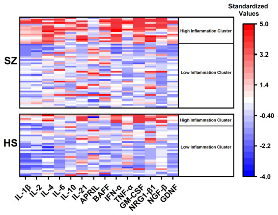 Heatmap and cluster analysis of biomarker data in SZ and HS groups. Heatmap colors reflect normalized data on biomarker levels. Each row represents a specific participant. Using K-means clustering based on concentration data of 14 biomarkers, subgroups with signs of high inflammation (“High inflammation” cluster) or low inflammation (“Low inflammation” cluster) were identified in SZ and HS groups.