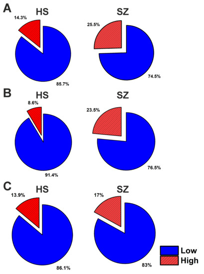 Psychiatric symptoms were assessed with the Positive and Negative Syndrome Scale (PANSS) [27]. The clinical status of patients was assessed by experienced clinicians. Based on PANSS scores, patients were divided into subgroups with predominantly negative and positive symptoms. Additionally, patients were also divided into subgroups depending on the response to therapy based on the consensus guidelines of the Treatment Response and Resistance to Psychosis Working Group published in 2017 [28]. Patients were classified into the treatment-resistant schizophrenia (TRS) subgroup under the following conditions: a poor response (PANSS scores > 60) to two different adequate doses (CPZeq > 600 mg per day) and course durations (>6 weeks) of non-clozapine antipsychotics. The rest of the patients were classified into the partially responsive schizophrenia (PRS) subgroup.