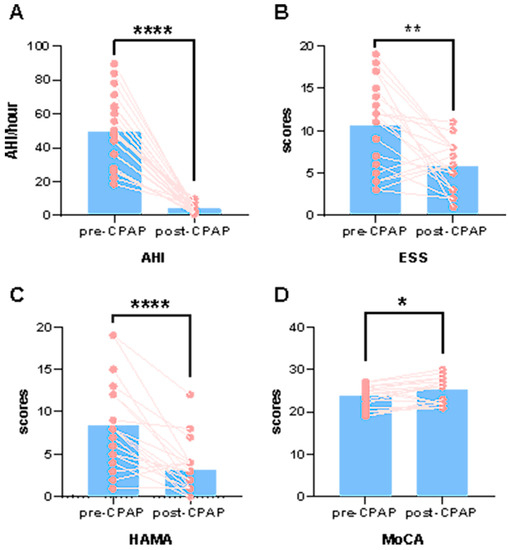 Clinical scores were changed between post-CPAP and pre-CPAP OSA patients. (A) The post-CPAP AHI (the post-CPAP AHI obtained from the ventilator data after the sixth month of treatment.), (B) ESS and (C) HAMA were significantly reduced compared to those in pre-CPAP OSA patients. (D) The post-CPAP MoCA scores were significantly increased compared to those in pre-CPAP OSA patients. * p < 0.05, ** p < 0.01, **** p < 0.0001.