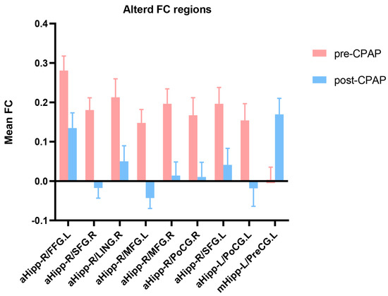 Mean weighted FC signal values of pre-CPAP and post-CPAP OSA patients in altered regional brain areas. FC, functional connectivity; pre-CPAP OSA, OSA patients before CPAP treatment; post-CPAP, OSA patients after CPAP treatment; FFG, fusiform gyrus; SFG, superior frontal gyrus; LING, lingual gyrus; MFG, middle frontal gyrus; PoCG, postcentral gyrus; PreCG, precentral gyrus; aHipp, anterior hippocampus; mHipp, middle hippocampus; L, left; R, right.