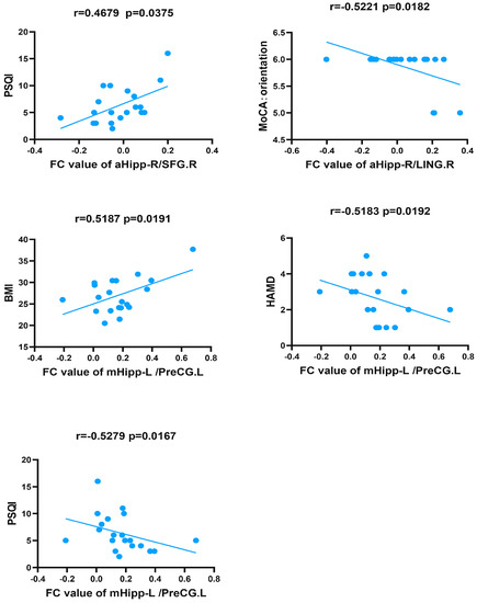 After 6 months of standard CPAP treatment, the FC value between the left PreCG and the left middle hippocampus was positively correlated with body mass index (BMI) and negatively correlated with HAMD and PSQI scores in patients with OSA. In addition, the FC value between the right anterior hippocampus and right LING was negatively correlated with orientation. Finally, there was a positive correlation between PSQI scores and FC values between the right SFG and right anterior hippocampus (Table 3 and Figure 4).
