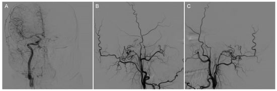 Tumors are the most common cause of intracranial mass lesions, such as gliomas, auditory neuromas, and intracranial metastases [,]. When an intracranial tumor grows to a certain volume, the intracranial occupying effect or neurological impairment worsens and becomes a typical symptom of tumorigenesis. Cerebral hemorrhage is also a common cause of intracranial mass lesion. It has an acute onset and is accompanied by severe neurological impairment []. Physicians should not only focus on the common causes of intracranial mass lesion but should consider all factors that might contribute to the disease. Considering that the intracranial mass lesion in this patient was caused by CCJAVFs, we thought that a vascular disease might be the cause of the intracranial mass lesion. Several studies have reported intracranial mass lesions caused by vascular abnormalities. For example, Khan et al. reported the case of a 45-year-old male who presented with rapidly progressive severe attention and memory deficits over a week, with an initial diagnosis of thalamic edema and venous embolism, which was eventually confirmed to be a brain dural arteriovenous fistula (DAVF). The nerve functions of the patient were restored after treatment []. Hanyu et al. reported the case of a 45-year-old male with a headache and a final angiographic diagnosis of DAVF, although he was initially suspected of having brain malignancy based on the results of positron emission tomography-CT (PET-CT) and MRI []. These cases have some similarities. For example, such patients have an acute onset and rapid progression, and clinical symptoms are mostly caused by occupying effects. However, these manifestations are nonspecific and are often ignored by clinicians. Intracranial mass lesions caused by arteriovenous malformations are often initially misdiagnosed, which might require angiography before treatment for a definitive diagnosis of arteriovenous malformations. Intracranial mass lesions caused by arteriovenous fistula might be associated with an increase in the size of the lesion due to primary changes, and clinical symptoms might be effectively relieved via timely treatment. In contrast, intracranial mass lesions caused by some vascular diseases might be caused by secondary injury to the nerve tissue, causing a tumor-like lesion effect. As it is a secondary change, its diagnosis is more challenging, and, thus, this condition often leads to a relatively poor prognosis.