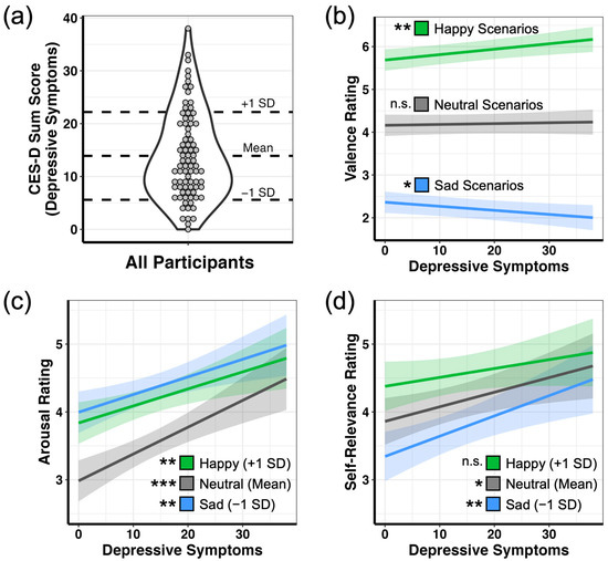 p = 0.155, 95% CI = [−0.024, 0.148]). Again, consistent with ECI, these increases in self-relevance ratings led to diminished differentiation between happy, sad, and neutral scenarios at high depressive symptoms (+1 SD, main effect of valence level: F