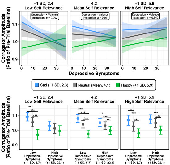 The consequences of these trends are made evident when comparing corrugator amplitude between sad, neutral, and happy scenarios at low (−1 SD) and high (+1 SD) levels of depressive symptoms (see