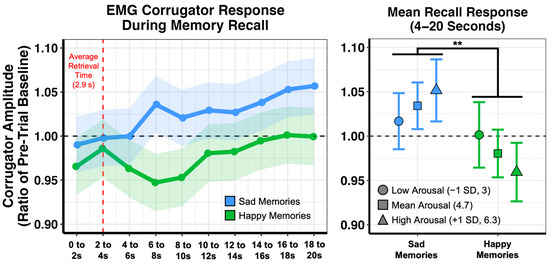 Figure 4). Examination of estimated marginal means again revealed that valence-related differentiation of the corrugator signal primarily emerged after participants had read the memory cue and initially retrieved the event (average retrieval time = 2.9 s, SD = 1.5). This differentiation in response was sustained throughout the recall period, as average corrugator amplitude 4 to 20s after memory cue onset was significantly different between recall groups (F