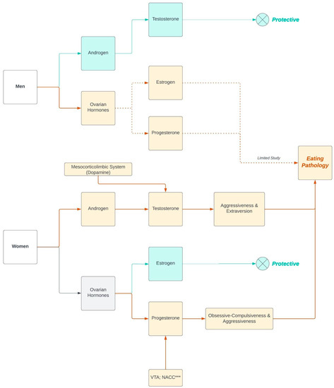 As far as we know, no study has examined the relationship between sex hormones and perfectionism. However, sex hormones may be related to other personality traits associated with eating pathologies. It is worth noting that researchers sometimes use the terms aggressiveness and impulsivity interchangeably, even though they are separate constructs that are correlated with each other [85,94,95]. In this review, we aim to demonstrate the similarity between aggressiveness and impulsivity regarding their associations with eating pathology, given their correlation.