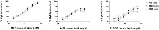 We found that all three drugs induced a cytotoxic effect in a concentration-dependent manner (Figure 1). In addition, the Dm values for ALB were 0.6 μM, 0.6 μM, and 0.9 μM in the C6, RG2, and U87 cell lines, respectively. For the ALBSO, the Dm values were 20 μM, 26 μM and 36 μM in the C6, RG2, and U87 cells, respectively. In the case of MLT, the obtained Dm values were 1 mM, 0.9 mM, and 0.9 mM, for C6, RG2, and U87 cells, respectively.