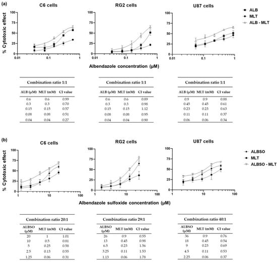 Due to the ability of ALB, ALBSO, as well as MLT to induce cytotoxicity in the C6, RG2, and U87 cells, we tested whether the combination of ALB with MLT and ALBSO with MLT could induce an additive or synergistic cytotoxic effect. Based on the Dm of each drug, we combined ALB with MLT in a 1:1 ratio concentration for all cell lines. In the case of the combination of ALBSO with MLT, the ratio concentrations were 20:1 for C6 cells, 29:1 for RG2 cells and 40:1 for U87 cells. The results showed that most of the combinations caused a higher percentage of cytotoxicity than the single drugs. According to the Chou–Talalay method, most of the combinations of ALB-MLT caused a synergistic cytotoxic effect (CI < 1.00). In the case of ALBSO-MLT, most of the combinations caused a synergistic cytotoxic effect in the C6 and U87 lines, while in the RG2 line, this synergy was found only in the combinations with the highest concentrations (Figure 2).
