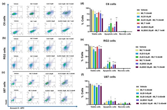 The combinations of MLT with ALB or ALBSO induced apoptosis. Representative dot plots and percentage of cells stained with Annexin V-APC/7AAD, quantified by flow cytometry after 48 h of treatment on C6 cells (a,d), RG2 cells (b,e), and U87 cells (c,f). The dot plots were divided in quadrants to quantify the viable cells (Q4: Annexin V-/7AAD-), total apoptotic cells (Q3: early apoptosis, Annexin V+/7AAD- plus Q2: late apoptosis, Annexin V+/7AAD+) and necrotic cells (Q1: Annexin V-/7AAD+). Data obtained from three independent experiments in triplicate (* p < 0.05, ** p < 0.01, compared to vehicle). Each bar represents mean ± SD.