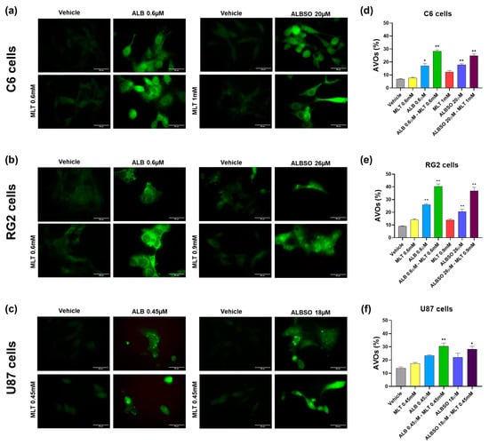 Next, we quantified the generation of AVOs in the tumor cells with AO staining by flow cytometry, indicating the percentage of cells with AVOs. In the C6 cells, the combination of ALB 0.6 μM-MLT 0.6 mM induced AVOs in 28.3% cells, statistically higher than the vehicle with 6.9%, MLT alone (7.8%), and ALB alone (17.1%) (p < 0.01), as seen in Figure 4d. Similarly, the combination ALBSO 20 μM-MLT 1 mM increased the C6 cells with AVOs, with a mean of 24.8%, statistically higher than MLT alone (12.4%) and ALBSO alone (17.9%) (p < 0.01). In the RG2 cells, the combination of ALB 0.6 μM-MLT 0.6 mM induced the highest percent of cells with AVOs (40.4%), statistically higher than the vehicle (9%), the MLT alone (14.1%), and the ALB alone (26%) (p < 0.01). Similarly, the combination of ALBSO 26 μM-MLT 0.9 mM induced a higher percent of RG2 cells with AVOs (37%), when compared to MLT alone (14%) and ALBSO alone (20.6%) (p < 0.01), as seen in Figure 4e. In the case of U87 cells, the combinations ALB 0.45 μM-MLT 0.45 mM and ALBSO 18 μM-MLT 0.45 mM induced a significative increase in cells with AVOs, showing values of 30.5% (p < 0.01) and 28.3% (p < 0.05), respectively, when compared to vehicle (13.7%), as seen in Figure 4f.
