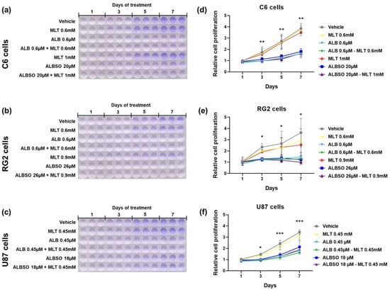The treatment with ALB and ALBSO inhibited proliferation, independently of MLT. Representative images of crystal violet-stained cells in 96-well plates and graph with relative cell proliferation obtained after 1, 3, 5, and 7 days of treatment on C6 cells (a,d), RG2 cells (b,e), and U87 cells (c,f). Data obtained from three independent experiments in triplicate (* p < 0.05, ** p < 0.01, *** p < 0.001, compared to vehicle). Each dot represents mean ± SD.