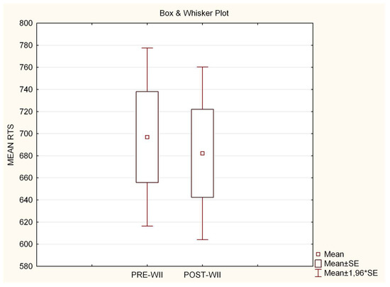 The t-test performed on RTs of correct answers comparing Pre- (mean RT: 696.91 +/− 159.17 SD) vs. Post-game (mean RT: 682.20 +/−154.35 SD) conditions did not show any significant changes in the speed of responses after the training (t = 0.26, p = 0.79), as depicted in Figure 5 representing the mean RTs.