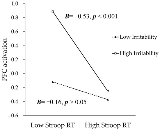 As shown in Figure 3, the association between Stroop RT and the PFC activation was stronger for children with higher levels of irritability. For children with low levels of irritability (−1 SD below the mean), the Stroop RT was not significantly linked with PFC activation (Simple slope = −0.16, t(94) = −1.29, p > 0.05). For children with high irritability (+1 SD above the mean), the Stroop RT was significantly and negatively associated with PFC activation (Simple slope = −0.53, t(94) = −3.99, p < 0.001), suggesting that highly irritable children utilize more PFC activation to respond faster during the cognitive flexibility task.