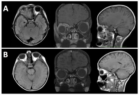 A 6-year-old boy was treated with orbital Ewing’s sarcoma suspicion. (A) Pre-operative MRI shows an extraconal lesion extended medially until ethmoidal cells. (B) Post-operative MRI confirms the removal of tumoral tissue.