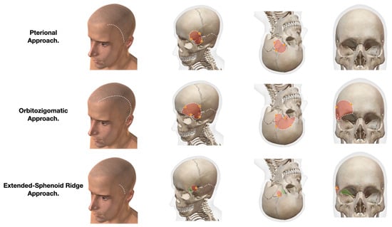 The pterional approach is the gold standard technique for treating several pathologies of the skull base [2,3,4,5,6,7,8,9]. This approach offers the opportunity to treat lesions of the anterior and middle fossa and of the union of the medium and upper third of the clivus. A combination with other surgical techniques, such as the orbitozigomatic approach, allows for the treatment of neoplastic lesions that occupy large and complex skull base compartments [2,10,11,12,13].