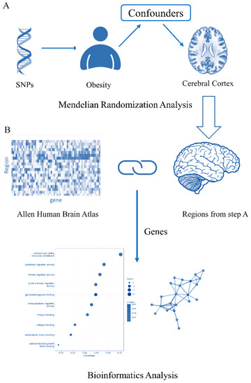 Flow diagram of the analysis pipeline used in the study. (A). Two-sample MR analyses were performed to evaluate the causal effect of obesity on the cortex structure. (B). Bioinformatics analyses were performed using genes that were differentially expressed in brain regions significantly indicated in step A.