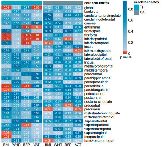 IVW estimates of various obesity parameters on brain cortical thickness and surface area. IVW estimates of various obesity parameters (BMI, WHR, BFP, and VAT) on brain cortical thickness and surface area. The color of each block represents the IVW-derived p-values of every MR analysis. The p-values < 0.05 are shown in red squares and p-values > 0.05 are shown in white or blue squares. BMI: body mass index; WHR: waist–hip ratio; BFP: body fat percentage; VAT: visceral adipose tissue; SA: surface area; TH: thickness; * p-value < 0.01.