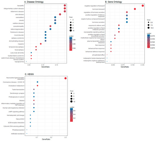 The results of the gene-enrichment analysis. (A) Disease ontology (DO); (B) Gene Ontology (GO); (C) Kyoto Encyclopedia of Genes and Genomes (KEGG).