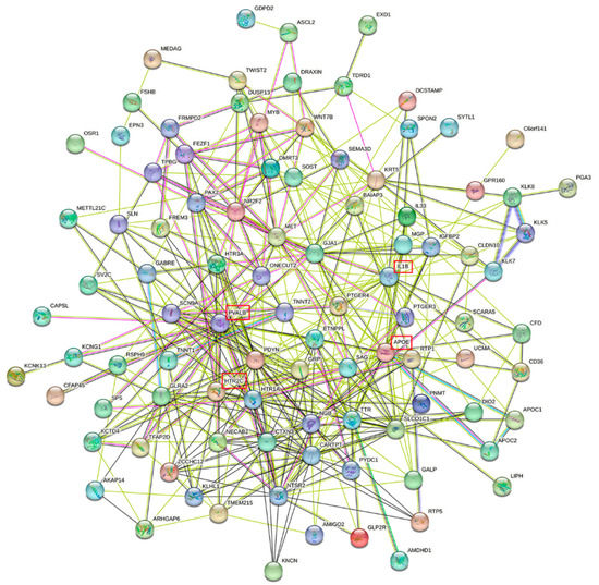 To further integrate obesity, the brain, and genes, we extracted the gene sets from the Allen Human Brain Atlas (AHBA) in the nine brain regions associated with four obesity indexes in the thickness MR study (entorhinal, fusiform, inferior parietal, pars orbitalis, pars triangularis, superior parietal, supramarginal, and temporal pole). Then, all genes expressed in these gyri were transited in entrezid and were enriched in the disease ontology (Figure 4A), the BP terms of GO (Figure 4B), and the KEGG pathway (Figure 4C). Biological processes, such as negative regulation of transport, hormone transport, regulation of hormone secretion, neuropeptide-signaling pathway, and organic hydroxy-compound transport, were examples of significantly enriched GO terms. The gene set was enriched in KEGG pathways such as neuroactive ligand–receptor interaction, cholesterol metabolism, and serotonergic synapse. In the DO-enrichment analysis, these related regions contained a highly enriched set of genes involved in some neuropsychiatric disorders, specifically Alzheimer’s disease, Parkinson’s disease, Lewy-body dementia, tauopathy, migraine, mood disorder, temporal lobe epilepsy, and focal epilepsy. The protein–protein interaction (PPI) network was created by using the website STRING (Figure 5). Network nodes represent proteins, the edges represent functional and physical protein–protein associations, and the line color represents different types of protein-interaction evidence. The green lines represent evidence from text mining, the pink lines evidence from experiments, and the blue lines evidence from databases. Finally, 105 nodes formed a network with 418 edges, and the average node degree was 7.96. Hubs were the most connected nodes within the network and were also responsible for maintaining the connectivity of the network [39]. Some key molecules, such as APOE, IL-1β, HTR2C, PVALB, PDYN, CARTPT, HTR1A, and NR2F2, served as the hub proteins. They formed an interacting community with other proteins.