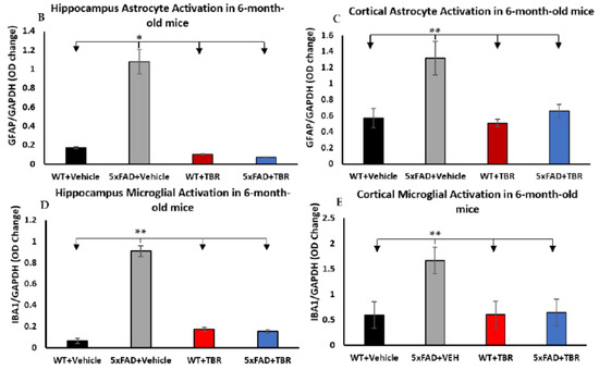 p < 0.05). The 6-month-old female 5xFAD mice treated with TBR were not significantly different than the female mice treated with vehicle (