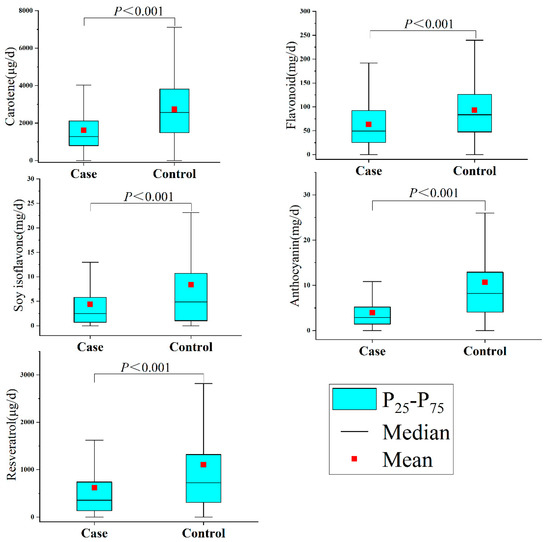 In terms of phytochemicals, as shown in Figure 1, the intake of phytochemicals was substantially higher in the controls than in the cases. Additionally, the analysis of phytochemicals revealed significant correlations between them in Table S1 (Spearman correlation coefficients range from 0.386 to 0.815).