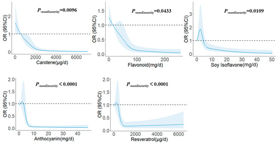 Based on the subgroups organized by confounding factors, the multivariate model’s logistic regression was used for the subgroup analysis. Sensitivity analysis was performed by calculating the phytochemical intake per unit body weight and repeated logistic regression to avoid the influence of body weight difference. Additionally, to get around the inherent limitations of using phytochemicals as grade variables, the restricted cubic spline function was used to explore the dose–response relationship in Model 2, in which four nodes were located in the 20th, 40th, 60th, and 80th percentiles of phytochemical intake, and the 10th percentile was used as the reference group (OR = 1) [28].