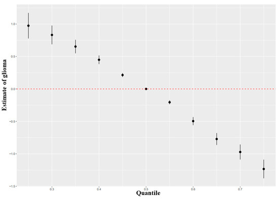 We also used Bayesian Kernel Machine Regression (BKMR) to assess the association between the combined effects of these phytochemicals and glioma. BKMR model analyzed the nonlinear and non-additive exposure–response relationship through iterative regression and Bayesian algorithm [31,32]. The model used a Markov Chain Monte Carlo algorithm with 10,000 iterations using a Gaussian kernel. By comparing the estimated effects of all phytochemicals for a particular percentile with the estimated effects of all phytochemicals for the 50th percentile, we were able to assess the total impact of the consumption of the five phytochemicals on glioma. While maintaining the consumption of other phytochemicals at the median, the exposure-response function was used to investigate the connection between specific phytochemicals and gliomas. Finally, the interaction between the effects of any two phytochemicals on glioma was investigated and the effect of different quantiles of one phytochemical on the association between the other phytochemical and glioma was evaluated by establishing a bivariate pairwise exposure–response function. The phytochemical’s likelihood of being included in the model was computed as a conditional posterior inclusion probability (condPIP) by the model.