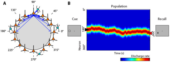 Individual neurons exhibit persistent activity with selectivity for spatial locations [51,52]. Computational models typically simulate persistent activity by networks of neurons with recurrent connections between similarly tuned units, as illustrated in Figure 1A [53,54].