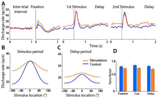 (A) Mean firing rate across PFC neurons with (orange) and without NB stimulation (blue) is shown for different task intervals, involving presentation of the best visual stimulus of each neuron. (B,C) Average tuning function from all PFC neurons for cue and delay period with and without stimulation; best stimulus has been shifted to 0° location in each case. (D) Mean Fano factor of spike counts during the fixation, cue, and delay period of the task under control and NB stimulation. From Ref. [98].