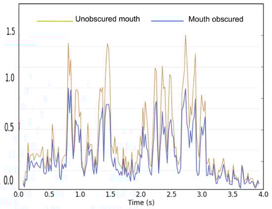 20]) of a speaker’s face with and without the mouth region obscured. The magnitude value is obtained by summing the magnitude components (polar coordinates) of the velocity vectors; thus, the magnitude signal represents the overall amount of motion, ignoring direction. As can be seen, the pattern of motion described by the two curves over time is very similar, with the mouth-obscured curve simply having less overall motion.