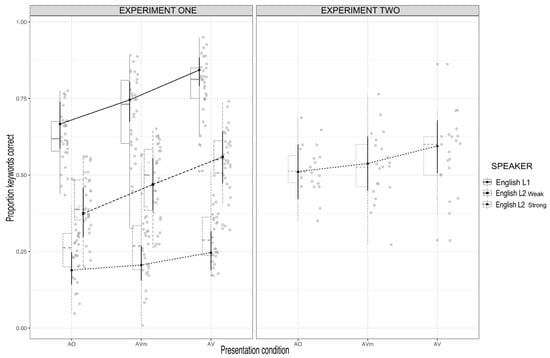 Figure 3. The figure shows the mean proportion of correctly identified keywords as a function of Presentation Condition and Speaker.