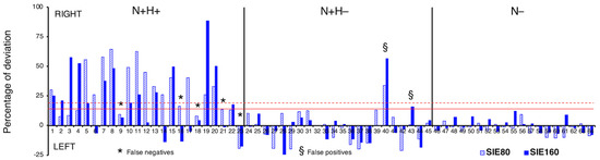 Individual SIE80 and SIE160 scores of the BRIT. Individual left- (negative) and rightward (positive) percentages of deviation (i.e., SIE scores) for the short (80 mm; shaded bars) and long (160 mm; full colour bars) lines as for 23 N+H+ (left panel), 22 N+H– (middle panel), and 19 N– (right panel) patients. The red horizontal lines represent the SIE cut-offs for the short (+19.50; dashed) and long (+14.75; continuous) lines. False negatives are identified by an asterisk, false positives by a section sign.