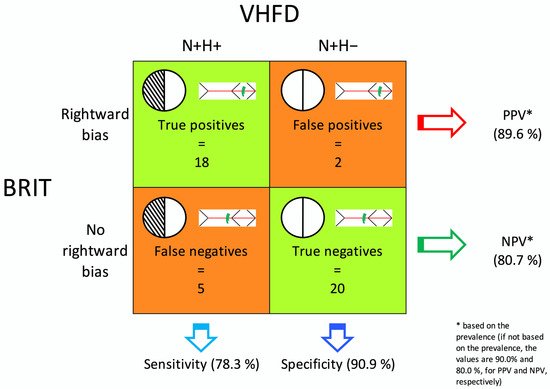 Overview of the accuracy of the BRIT. Number of true/false positive/negative cases classified based on the presence/absence of the VHFD (as assessed by the Humphrey automated static visual field test) and the BRIT outcome (presence/absence of a Rightward Bias in the SIE score). Sensitivity, specificity, PPV, and NPV based on such figures are also reported (cf. Section 3.5).