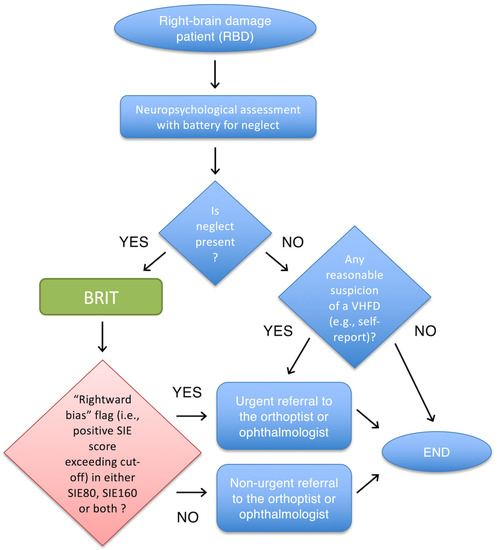 In such cases, a practical solution could be the use of an already existing paper-and-pencil test such as the BRIT [23], which is quick and easy to administer to neglect patients for a first screening for possible VHFD. The BRIT represents the most recent work based on the Brentano illusion [24,25,26,27], which reports normative data on healthy adults, but does not provide indications about the accuracy of the test. Therefore, we felt urged to address this issue (as well as others, see below), by designing a study to determine the sensitivity and specificity, as well as the PPV and NPV of this test. If the BRIT is effective, it may conveniently be used as a quick and simple way to screen neglect patients for the presence of VHFD and—in case of a Rightward Bias flagged in the SIE score—to immediately refer them to an orthoptist/ophthalmologist.