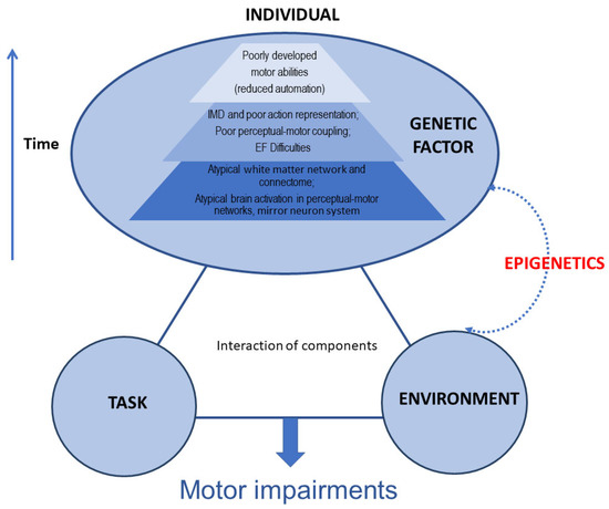 Compared with other neurodevelopmental conditions affecting children, research on the genetics of DCD is relatively limited in both scope and quantity. Motor impairment can result from complex interactions between environmental and genetic factors. Epigenetic mechanisms, such as DNA methylation and histone modifications, may play a key role in mediating these interactions. Environmental factors, such as exposure to toxins, can cause epigenetic modifications that alter the expression of genes involved in motor function. Similarly, genetic mutations or variations can affect epigenetic marks and modify gene expression patterns in response to environmental cues. These epigenetic changes can have long-lasting effects on neural development and function, leading to motor impairment in DCD. However, while there is evidence supporting a genetic contribution to DCD, the evidence is still in its early stages, and much of the current evidence is based on studies of co-occurring conditions. Given the possibility of a shared genetic susceptibility between DCD and other neurodevelopmental disorders, future research could involve large samples of DCD-affected children as well as healthy children. Case-control and cohort studies could be conducted using whole exome sequencing and whole genome sequencing methods while taking into account the clinical manifestations and epidemiological characteristics of the disorder in the population. Genome-wide association studies (GWAS) will allow for the exploration of complex genetics and susceptibility. Analogous to other neurodevelopmental disorders, such as ADHD and ASD, the genomic architecture of DCD is likely to be highly complex, and there are currently no genes or epigenetic mechanisms directly and robustly linked to DCD. It will also be important to control potential confounding factors, such as age, in order to identify the genetic basis of DCD onset and provide insights into early diagnosis and intervention. By studying genetically homogeneous groups of individuals with reciprocal deletions and duplications who are willing to participate in long-term neuropsychometric and neuroimaging protocols, researchers will gain invaluable insight into the primary and secondary effects of genes on neurodevelopmental functions.