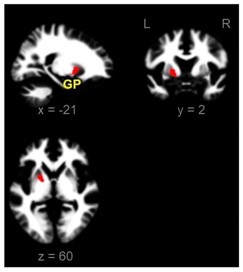 There was no significant difference in the GM between the two groups. In the WM, ADPs showed reduced volumes in the GP (two-sample t-test, p-FWE < 0.05, and cluster size > 100 voxel)s (Figure 2).