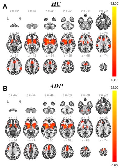 Table 1 shows demographic and clinical characteristics of the ADPs and HCs. No differences between the two groups were noted in terms of age, handedness, and sex distribution; however, there were significant differences in the levels of education and durations of cigarette smoking. The days of alcohol consumption per week were 4.73 ± 2.05 (mean ± SD) and 1.57 ± 1.79 days for ADPs and HCs, respectively.