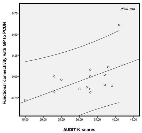 The correlation between AUDIT-K scores and functional connectivity of the precuneus (PCUN) linked to the globus pallidus (GP) with reduced white matter volume in alcohol-dependent patients (r = 0.546, p = 0.036). The curved line bands indicate 95% confidence intervals. AUDIT-K, Alcohol Use Disorders Identification Test-Korea.