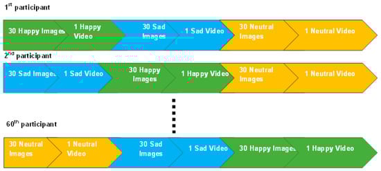 Throughout the experimental procedure, the participants were exposed to a diverse array of emotional stimuli comprising three categories—happy, sad, and neutral stimuli—in both images and videos. The participants were presented with a sequence of stimuli, with each sequence consisting of 30 images and a video of the same emotional valence at the end. EEG signals were recorded, while participants viewed stimuli, using a 32-lead EEG system with a standard 10–20 system. The impedance of each electrode was checked below 5 k-ohms. The set of 2-min eyes-open and 2-min eyes-closed EEG was recorded to calculate resting EEG features. All participants then completed the three types of emotion induction trials. In order to get noise--free data, the subjects were asked to keep control of their movement during the experiment. EEG signals were recorded using a Mitsar EEG Amplifier, with a sampling rate at 256 Hz. EEG recordings were taken in a quiet room, and participants were asked to sit comfortably in a chair and view images and videos without outside influences. The sequencing of these stimuli (happy, sad, and neutral) was conducted in a randomized fashion for each individual to avoid any potential biases or confounding variables. Specifically, each participant viewed 30 images and 1 video for each of the 3 emotional categories, resulting in a total of 90 images and 3 videos per participant (shown in Figure 2). Based on our previous study [], and in order to investigate the potential impact of emotional stimuli on personality traits, the stimuli used in this study were sorted based on their arousal–valence score, ranging from the lowest to the highest, in order to accumulate the emotional effects of each stimulus and investigate potential differences in personality traits. By manipulating the emotional content of the stimuli, we aimed to elicit varied emotional responses in participants.