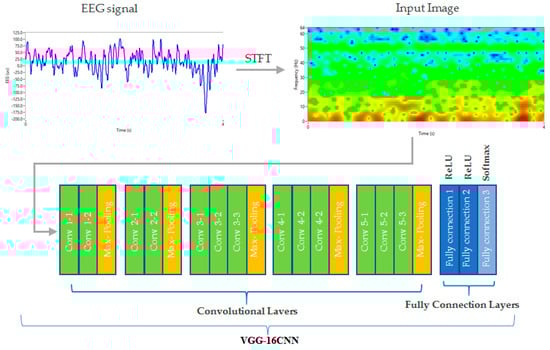 The VGG-16 CNN (Convolutional Neural Network) is a deep learning architecture developed by the Visual Geometry Group at the University of Oxford []. It consists of 16 layers, including 13 convolutional layers and 3 fully connected layers. The architecture of the VGG-16 CNN is characterized by its use of small filters (3 × 3) with a small stride size (1 × 1), which allows for a more fine-grained analysis of the input data. The convolutional layers are followed by max-pooling layers, which reduce the spatial dimensions of the feature maps and increase their translation invariance [,]. Our approach of using a pre-trained CNN to extract features from EEG data allowed us to effectively capture complex patterns and representations that are difficult to extract using traditional signal-processing techniques. The resulting feature representation can be used for further analysis and the classification of emotional states (Figure 5).
