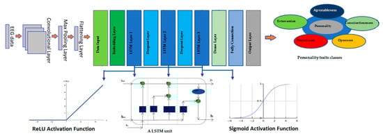 Deep learning is a field of machine learning that involves developing algorithms designed to learn the functionality of the human brain. Examples of deep learning algorithms include Convolutional Neural Networks (CNNs), Deep Neural Networks (DNNs), and Recurrent Neural Networks (RNNs). The term “deep” refers to the number of network layers employed, with deep networks containing over 100 layers compared to the 2 to 3 layers typically found in traditional networks. In this study, we proposed a conceptual model to learn features, recognize, and classify emotional valence and arousal labels, based on Russell model [] of the presented EEG signals. A CNN network is employed to extract emotional features from the EEG signals, and a Long Short-Term Memory (LSTM) network is used to obtain personality traits from the extracted features without the explicit hand-crafted feature-extraction process. CNNs are commonly used in image processing, and they can learn to extract meaningful features from images. LSTM networks, on the other hand, are commonly used in sequence modeling, and they can learn to capture temporal dependencies in sequential data [].