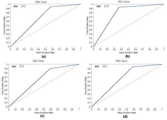 ROC curve of a CNN based on VGG-16: (a) low arousal-high valence (LV-HA), (b) high arousal-high valence (HV-HA), (c) low arousal-low valence (LV-LA), and (d) high arousal-low valence (HV-LA).