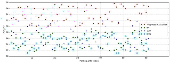The average accuracy of KNN, SVM, and BN classifiers, as well as the proposed network for all participants.