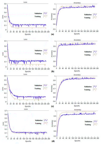 Figure 9 illustrates the loss and accuracy of the proposed network. As shown in Figure 9a, the loss and accuracy of the model converge after about 80 and 120 epochs, respectively. Within the first 40 epochs, model accuracy of 91.23% was achieved for low arousal-high valence (LV-HA). The accuracy improved gradually from epoch 40 to 140, reaching 92.12%. The model then stabilized between epochs 140 and 250, ultimately achieving a high accuracy of 94.68%. Figure 9b displays the convergence of the algorithm’s loss and accuracy, at roughly 30 and 40 epochs, respectively. The accuracy steadily increased from epoch 40 to 160, reaching a maximum of 92.63%. Following this, the model maintained stability between epochs 160 and 250, ultimately achieving a high accuracy level of 93.91%. Figure 9c, low arousal-low valence (LV-LA), demonstrates that the network’s loss and accuracy reach convergence after approximately 80 and 60 epochs, respectively. The accuracy displays gradual improvement from epoch 60 to 120, culminating in a peak of 94.21%. Between epochs 120 and 250, the model stabilizes, eventually attaining a high accuracy level of 94.83%. Finally, the algorithm’s loss and accuracy, presented in Figure 9d for high arousal-low valence (HV-LA), converge at around 40 and 40 epochs, respectively. The accuracy steadily improves from epoch 40 to 60, peaking at 92.75%, before stabilizing between epochs 60 and 250. Ultimately, the model achieves a high accuracy of 92.43%.