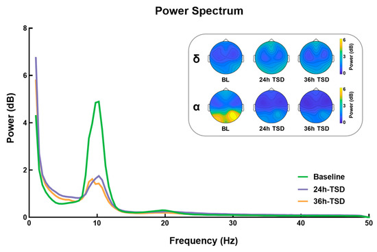 Differences between power and topographic maps under three conditions: baseline (BL), 24 h of sleep deprivation (24 h TSD), and 36 h of sleep deprivation (36 h TSD).
