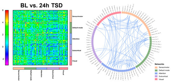 Functional connectivity between baseline (BL) versus (vs.) 24 h of sleep deprivation (24 h TSD) in 90 brain regions, and significant functional connectivity among brain regions.