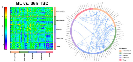 Functional connectivity between baseline (BL) versus (vs.) 36 h of sleep deprivation (36 h TSD) in 90 brain regions, and significant functional connectivity among brain regions.
