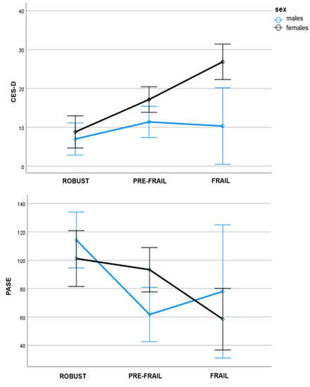 Finally, a significant interaction between the frailty phenotype and sex was observed for the CES-D (p = 0.014, partial η2 = 0.091, ω = 0.750) and the PASE (p = 0.042, partial η2 = 0.069, ω = 0.612) (Figure 1. In detail, in the female group, the worsening of the fragility condition was associated with an increment in depressive symptomatology while in the male group the depressive symptoms remained mostly stable across all frailty phenotypes. For the PASE variable, in males, the decrement in physical activity is observed already in the pre-frail stage while in the females this occurs mainly at the frail stage.