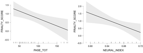Marginal effect plots of the effects of PASE, and neural index on frailty score in the males’ group.