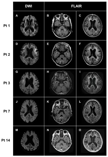 Characteristic MRI findings. Representative MRI images in Pt 1 (A–C), Pt 2 (D–F), Pt 3 (G–I), Pt 7 (J–L), and Pt 14 (M–O) were shown. High-intensity lesions of various degrees along with the U-fibers were observed on DWI (A,D,G,J,M). High-intensity lesions in the middle cerebellar peduncles (B) and paravermal lesions (E,K) appeared as cerebellar abnormalities on FLAIR. Bilateral white matter changes of various degrees were detected in all patients (C,F,I,L,O). DWI: diffusion-weighted image; FLAIR: fluid attenuated inversion recovery.